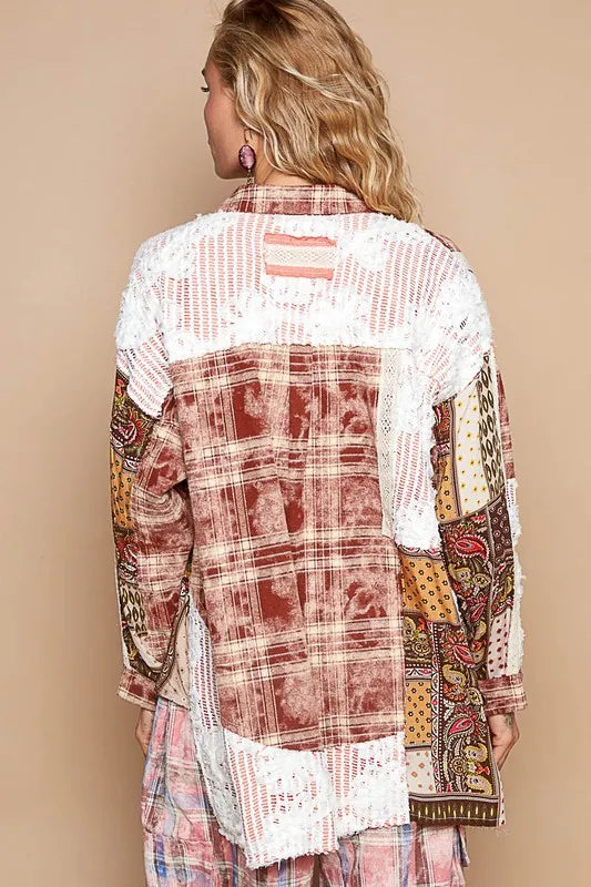 POL Button Down Lace Detail Floral Shacket with Contrast Plaid Patchwork