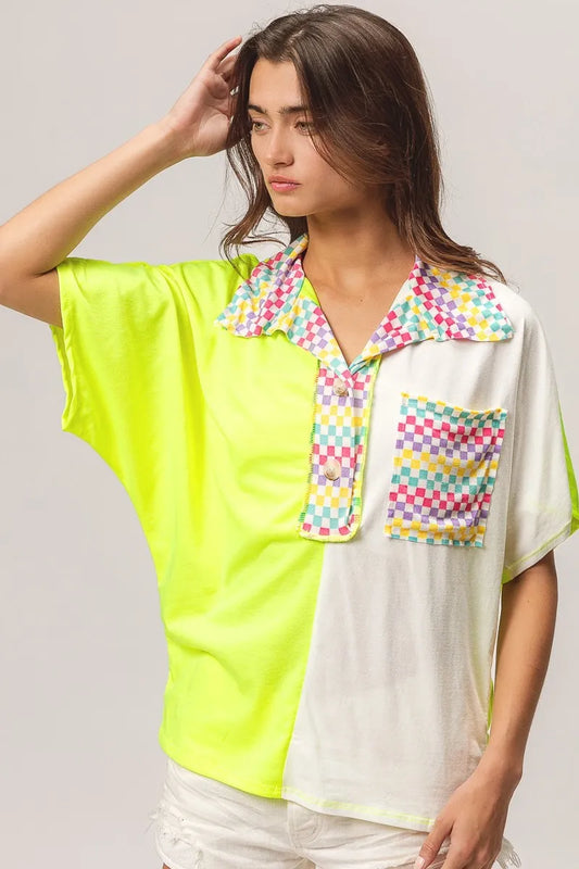 BiBi Color Block Knit with Multi Checker Contrast Top