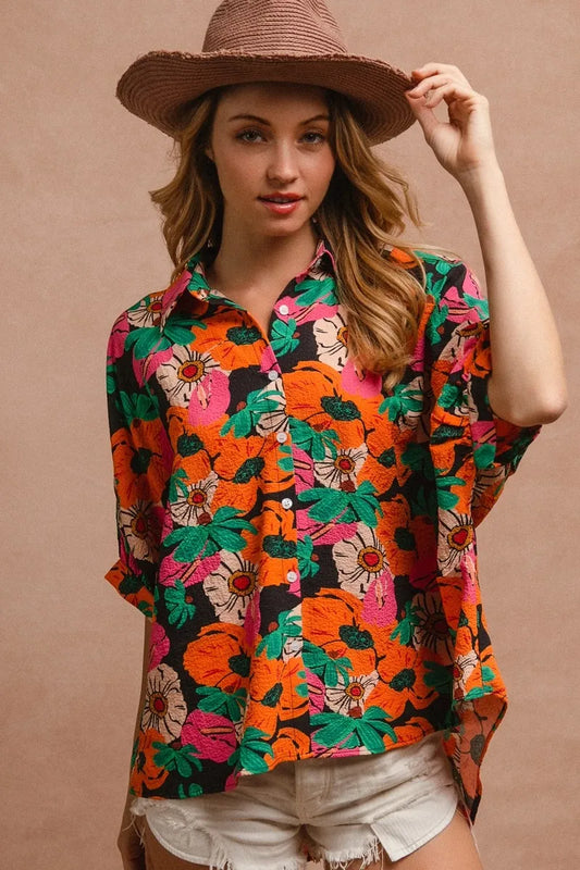 BiBi Floral Print Soft Crinkle Short Dolman Sleeves Blouse