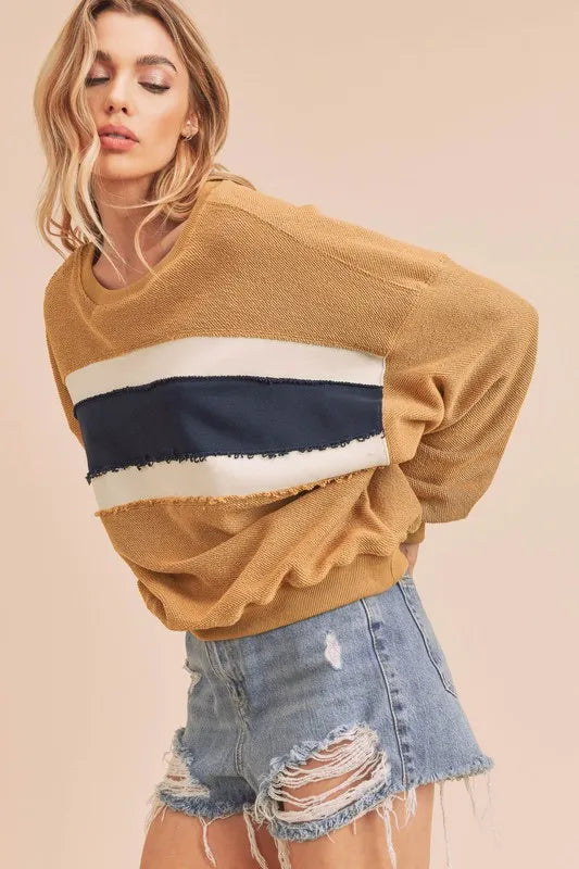 Aemi + Co Raw Hem Contrast Striped Dolman Sleeve Sweatshirt