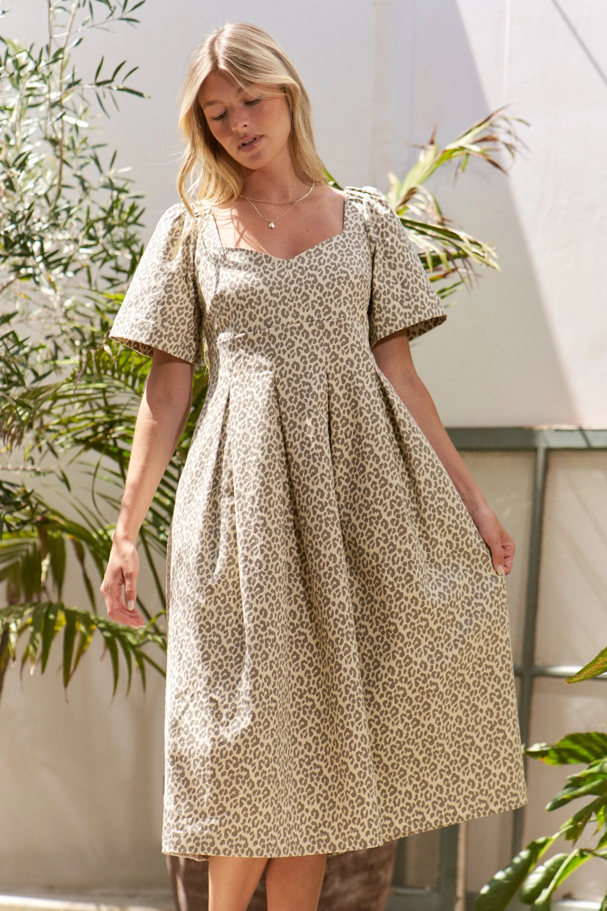 This stunning midi dress features an eye-catching leopard print pattern in neutral tones, crafted with a feminine square neckline and decorative button-front detail. The bell sleeves add a bohemian touch while the fit-and-flare silhouette creates a universally flattering shape. Made from lightweight, breathable fabric perfect for warm weather, this versatile piece transitions effortlessly from casual daytime wear to evening occasions. The midi length offers modest coverage while maintaining a stylish aesthetic.