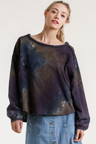 Umgee Full Size Tie Dye Round Neck Long Balloon Sleeve Top Plus Size