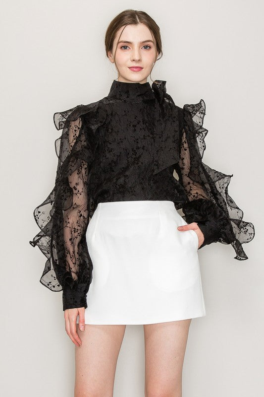 Elevate your wardrobe with this elegant High Neck Floral Blouse. Featuring delicate frilled sleeves, a neck ribbon detail, and a back button closure for a sophisticated touch. Perfect for adding a touch of luxury to any outfit.