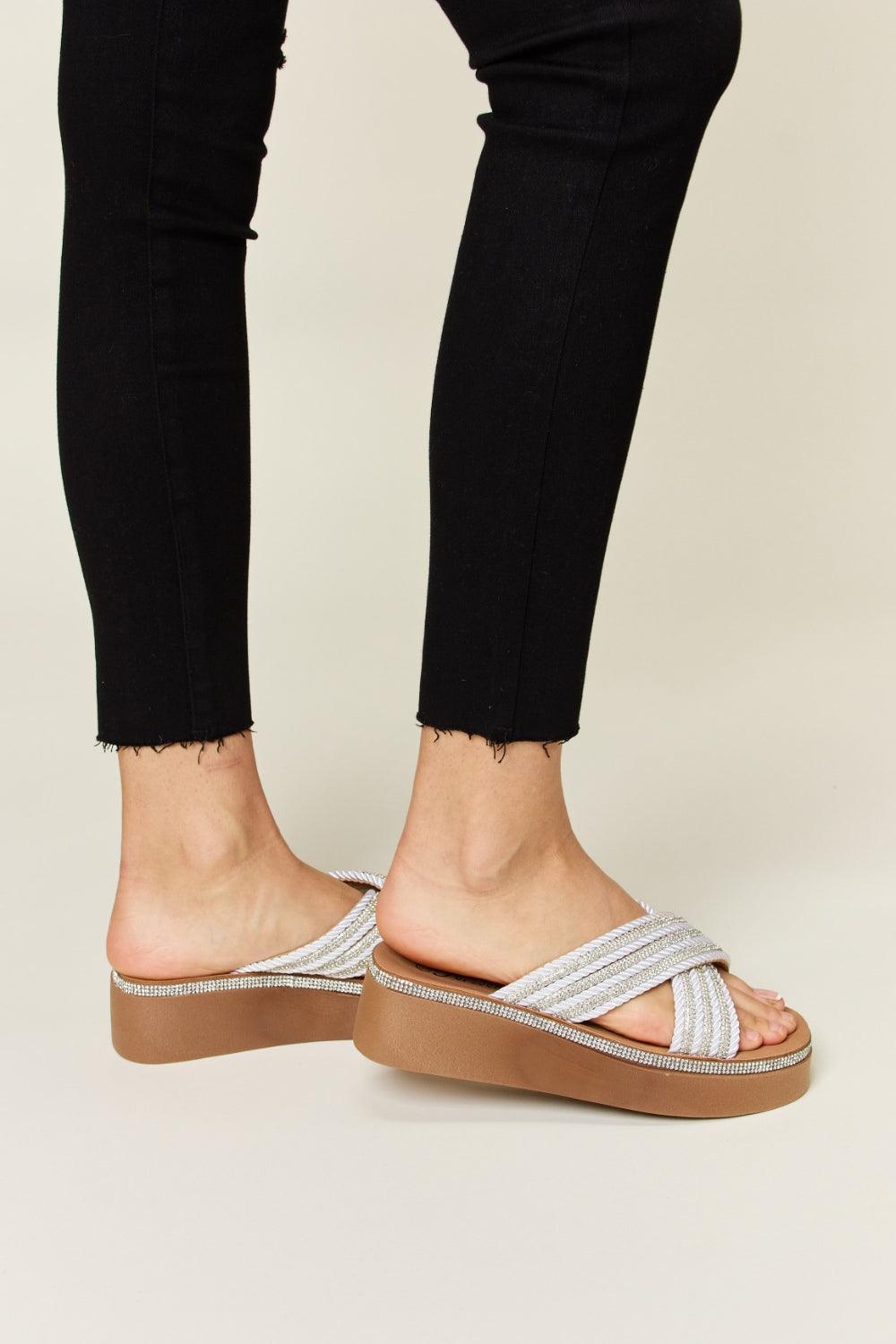 The Rhinestone Platform Wedge Sandal is a show-stopping choice for adding glamour to your outfit. The platform design offers extra height and comfort, making them perfect for all-day wear. Sparkling rhinestones adorn the straps, adding a touch of elegance and sophistication. The wedge heel provides stability and support, while the platform adds a trendy and stylish touch. Whether you're dressing up for a night out or want to elevate your look, these sandals are sure to make a statement. Step into these dazzling rhinestone platform wedge sandals and shine bright wherever you go.
