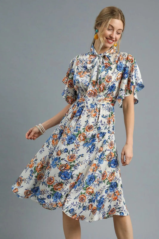 Umgee Printed Tie Neck Ruffle Cap Sleeve Dress