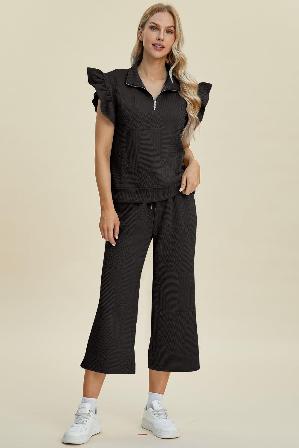 Double Take Full Size Texture Ruffle Short Sleeve Top and Wide Leg Pants Set