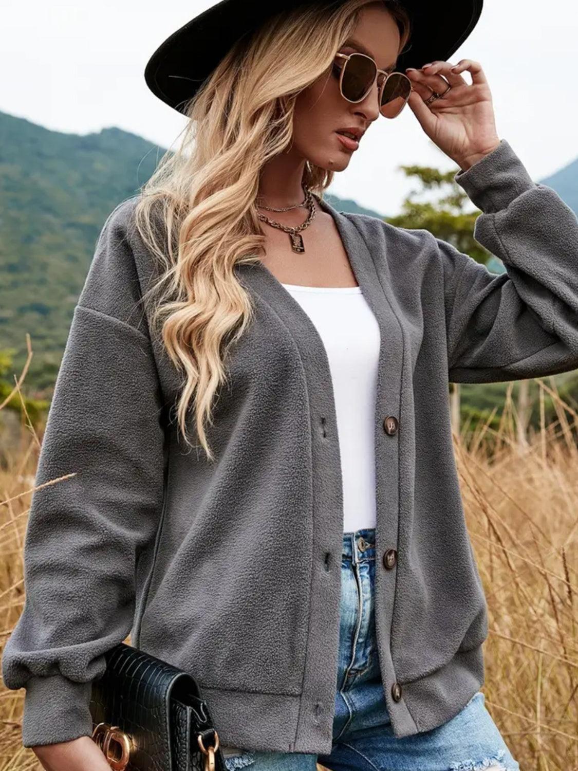 Shiny Button Down V-Neck Dropped Shoulder Jacket