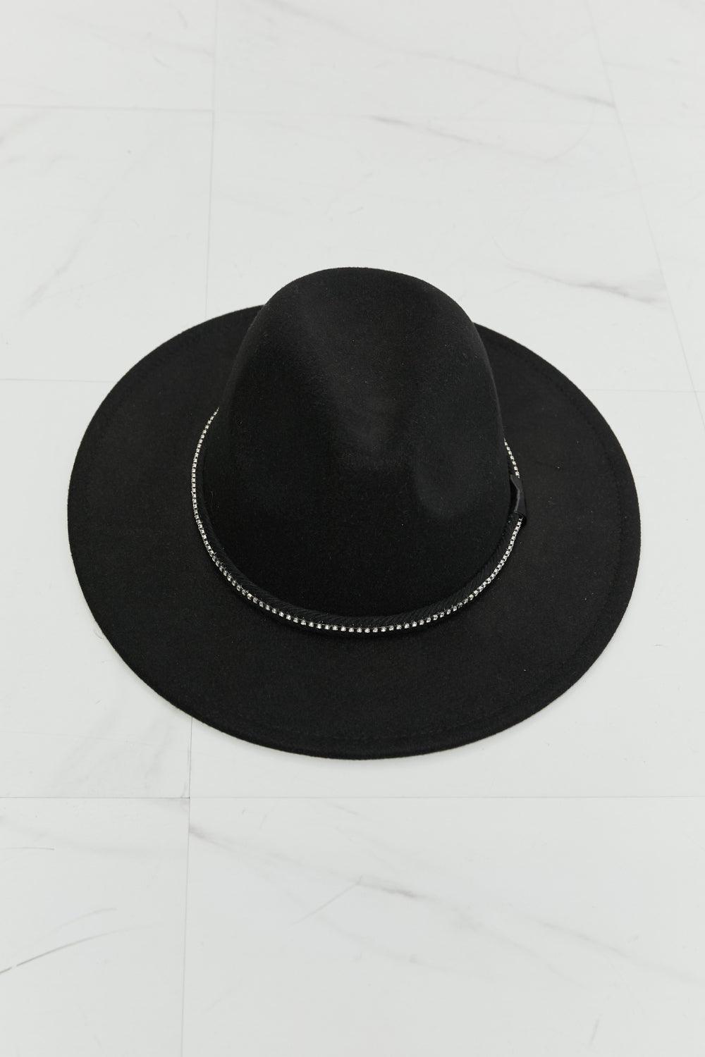 This hat is the perfect accessory for any occasion, adding a touch of sophistication and glamour to any outfit. This hat features a classic fedora shape with a wide brim, providing both style and practicality. The black color of the hat is versatile and can easily match with any outfit, while the mini rhinestone detailing adds a subtle yet beautiful touch of sparkle.