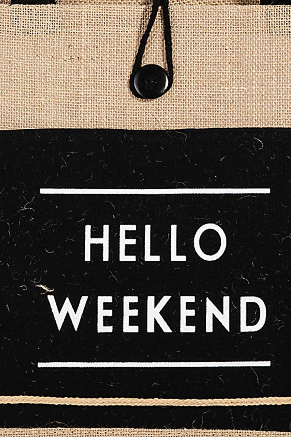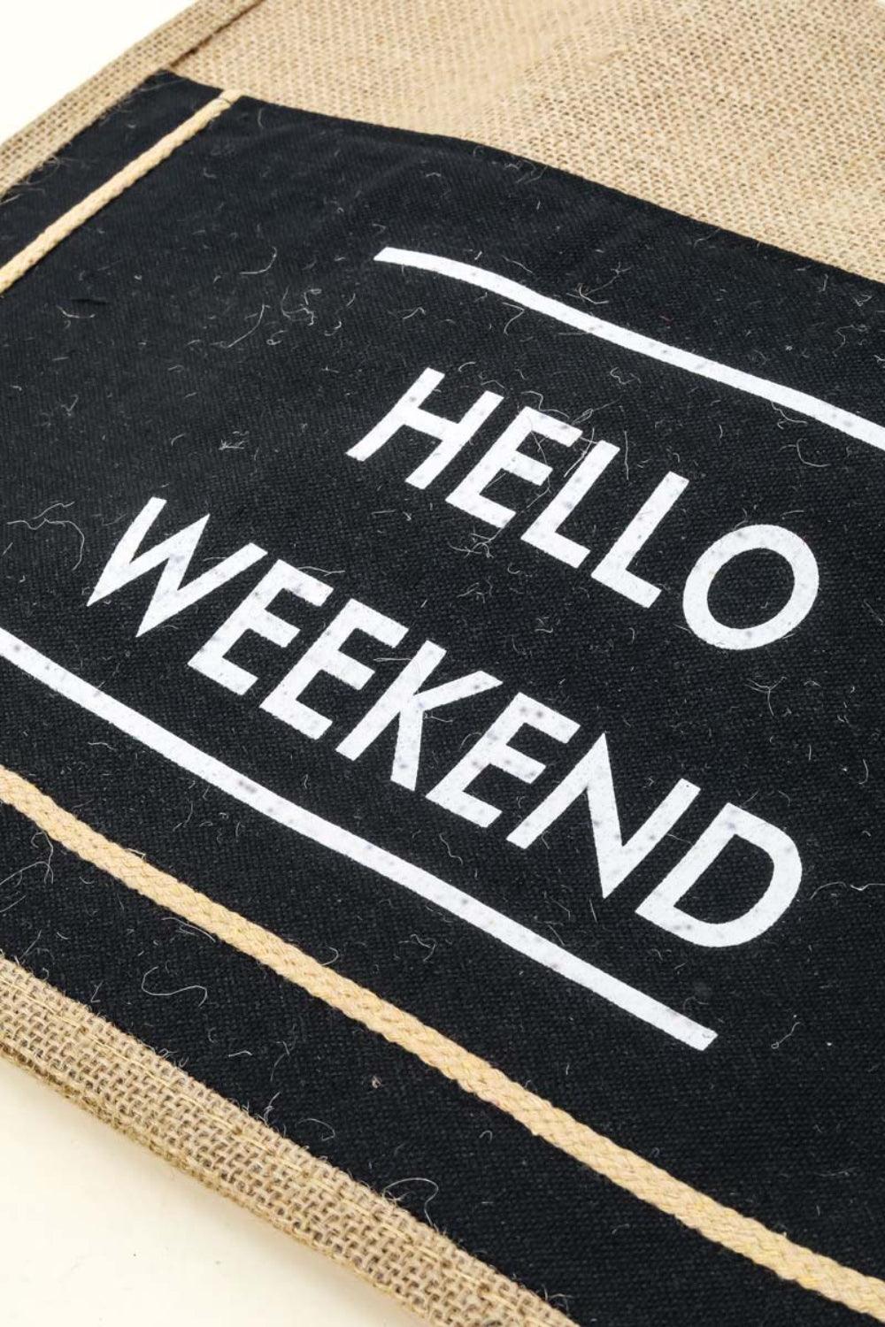 A stunning must have tote bag that is designed with a hello weekend burlap tote bag design. Perfect as a gift for a loved one!