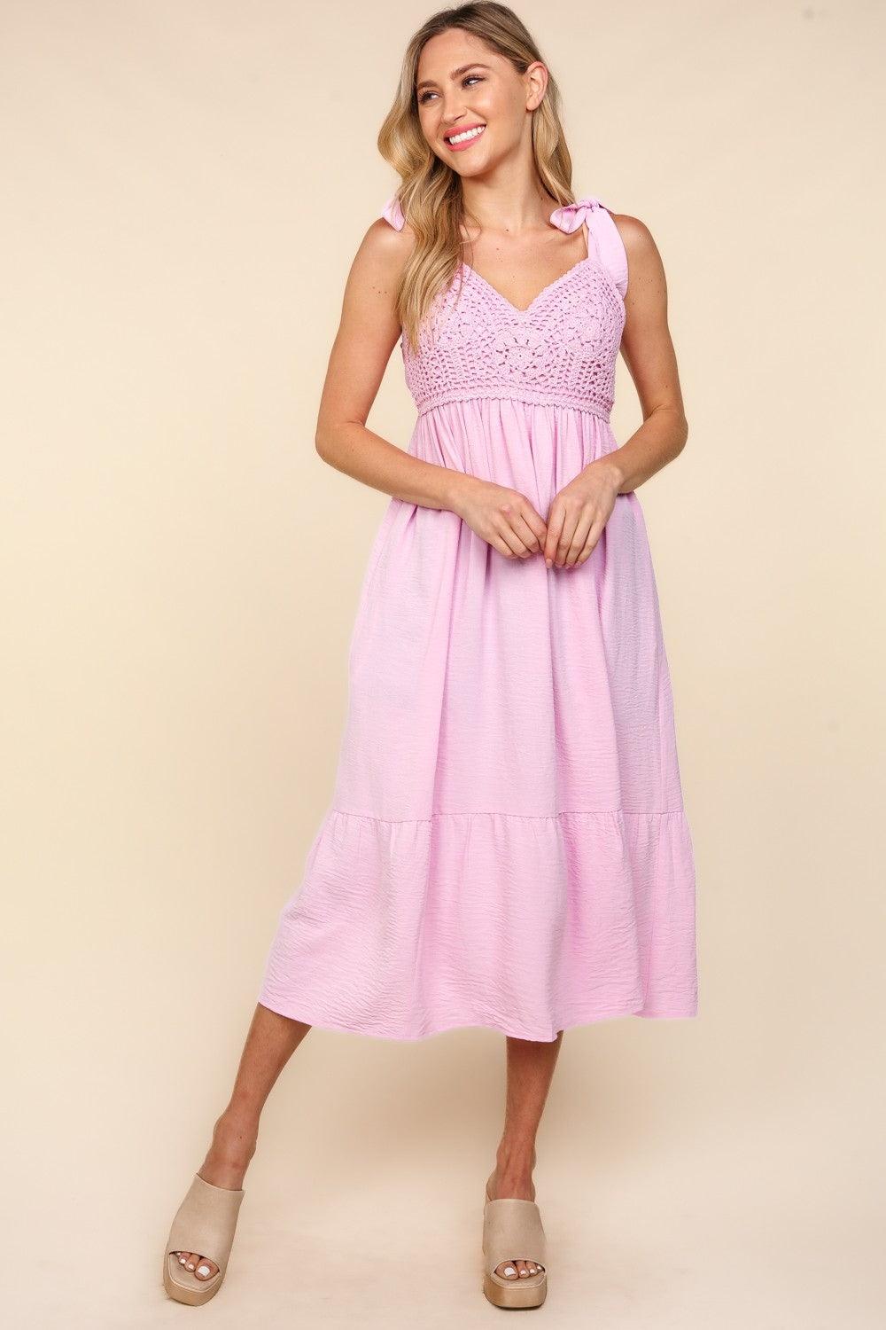 This V-neck sleeveless dress features delicate crochet lace and a flattering babydoll silhouette, making it a charming and elegant choice for any occasion. The midi length adds a touch of sophistication, while the side pocket offers practicality and convenience. Perfect for a summer day out or a special event, this dress combines style and comfort seamlessly. The solid woven fabric adds texture and depth to the overall design, creating a versatile piece that can be dressed up or down effortlessly. Embrace a feminine and romantic look with this lovely dress that exudes timeless appeal and chic elegance. Upgrade your wardrobe with this beautifully crafted piece that is sure to become a go-to favorite for any fashion-forward individual.