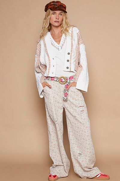 POL Cable-Knit Plaid V-Neck Button Up Cardigan