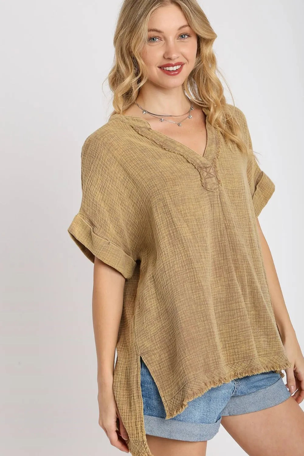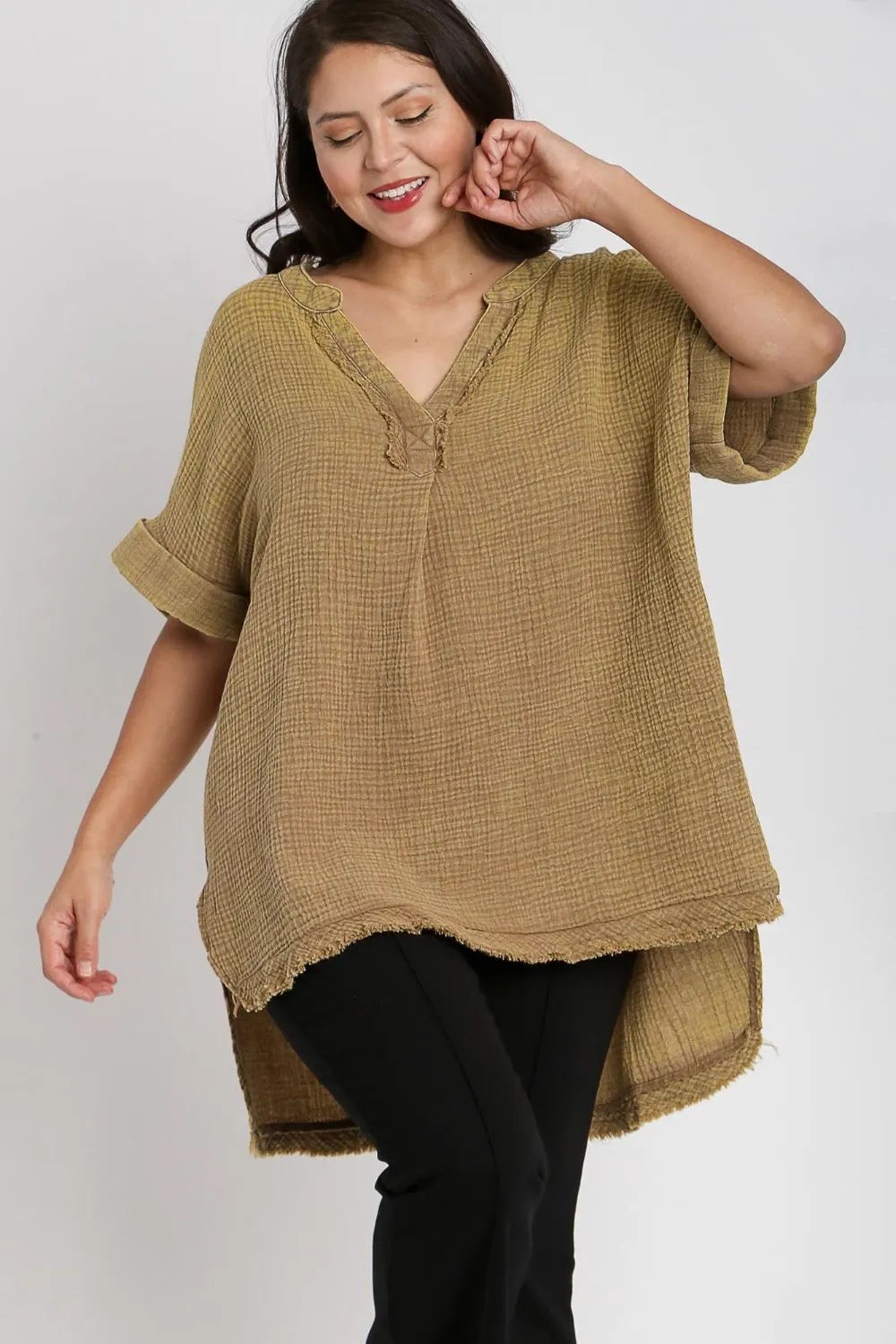 Umgee Full Size Side Slit Notched Mineral Wash Gauze Fabric Top Plus Size