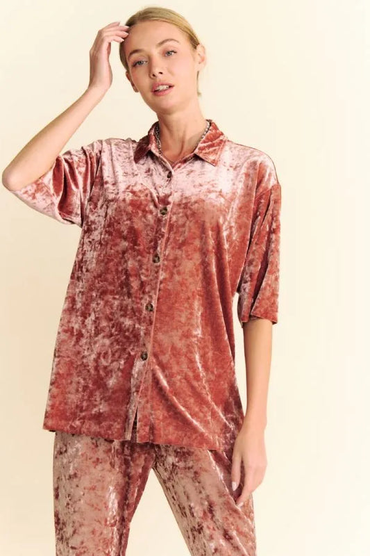 Davi & Dani Crushed Velvet Button Front Easy Lounge Shirt Top