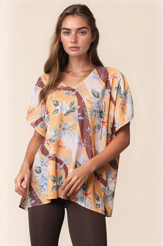 Davi & Dani Floral Printed V Neck Short Sleeve Loose Fit Top