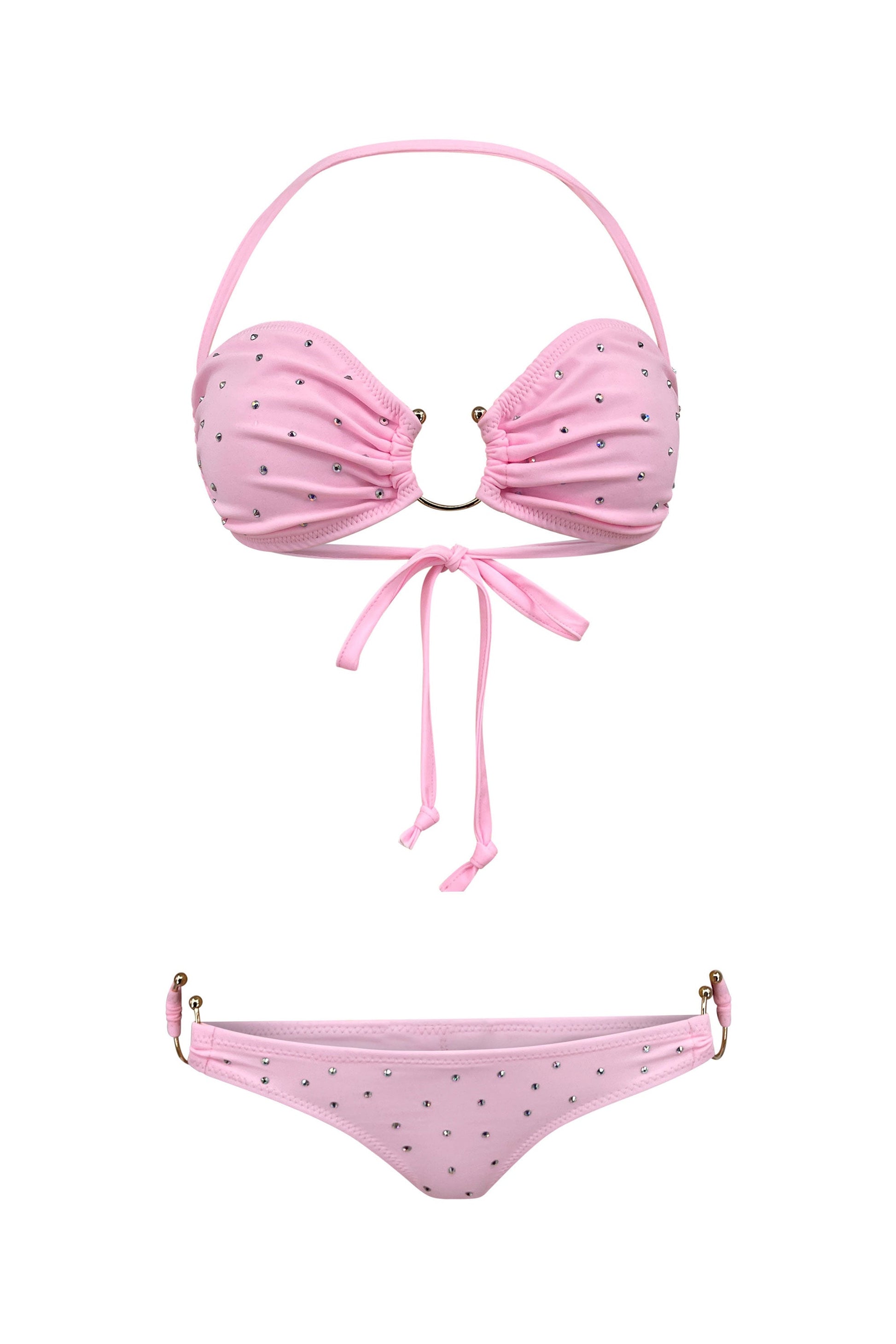 The Hailey Crystal Bikini shines in soft pastel pink, embellished with sparkling crystal rhinestones for a luxe, radiant finish. The bandeau top features a striking gold “U” ring centerpiece, while the step-in Brazilian bottoms mirror the look with double open gold “U” ring accents. A dazzling, feminine statement piece perfect for pink-lovers and sun-soaked moments.
